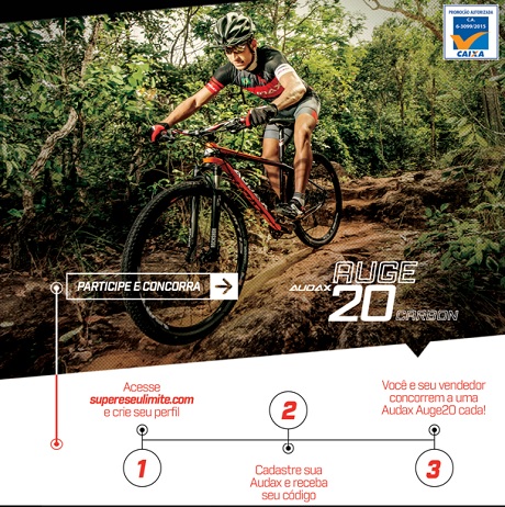 As pessoas que se interessarem em participar da promoção Supere Seu Limite vão ter a oportunidade de concorrer a duas Bicicletas Audax modelo Auge 20, quadro Audax Carbon MTB Expert, a bicicleta está avaliada em mais de 8 mil reais, já pensou se você for um ganhador?