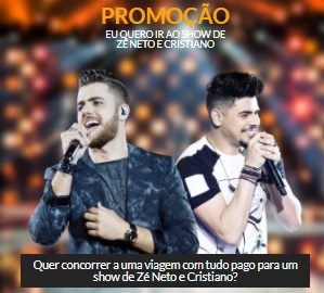 Cadastrar Promoção Eu Quero Ir Show Zé Neto E Cristiano, concorra a uma viagem com tudo pago para um show da dupla de sucesso.