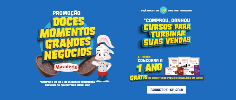 Só de participar da promoção já é possível garantir um dos cursos oferecidos e ainda concorrer ao grande prêmio principal da ação. Utilize os chocolates Mavalério na páscoa desse ano e garanta bons negócios, além disso, você vai receber só elogios por oferecer um chocolate de qualidade para seus clientes. Além disso, pode garantir a sua participação na promoção "Doces Momentos, Grandes Negócios" para ter a chance de ganhar muito chocolate de marca de qualidade que faz muito sucesso.