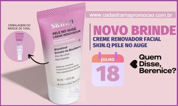 Prepare-se pois a partir do dia 18/07/2022 Quem Disse Berenice vai liberar o mais novo brinde grátis para você experimentar, dessa vez, quem realizar o cadastro vai ter a chance de retirar na loja mais próxima um creme renovador SKIN.Q Pele no Auge.