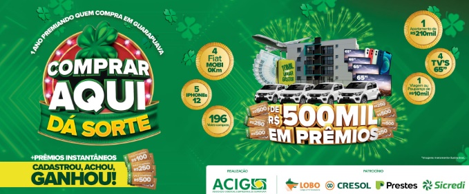 Aprenda a participar e se cadastrar na promoção especial ACIG Guarapuava 2023 "Comprar Aqui da Sorte" e tenha a chance de concorrer à 500 mil reais em prêmios, verifique as informações e a sua participação vai estar garantida para concorrer à apartamento, viagem, carros e muitos outros prêmios que estão sendo oferecidos, diversos consumidores já ganharam e você pode ser o próximo.